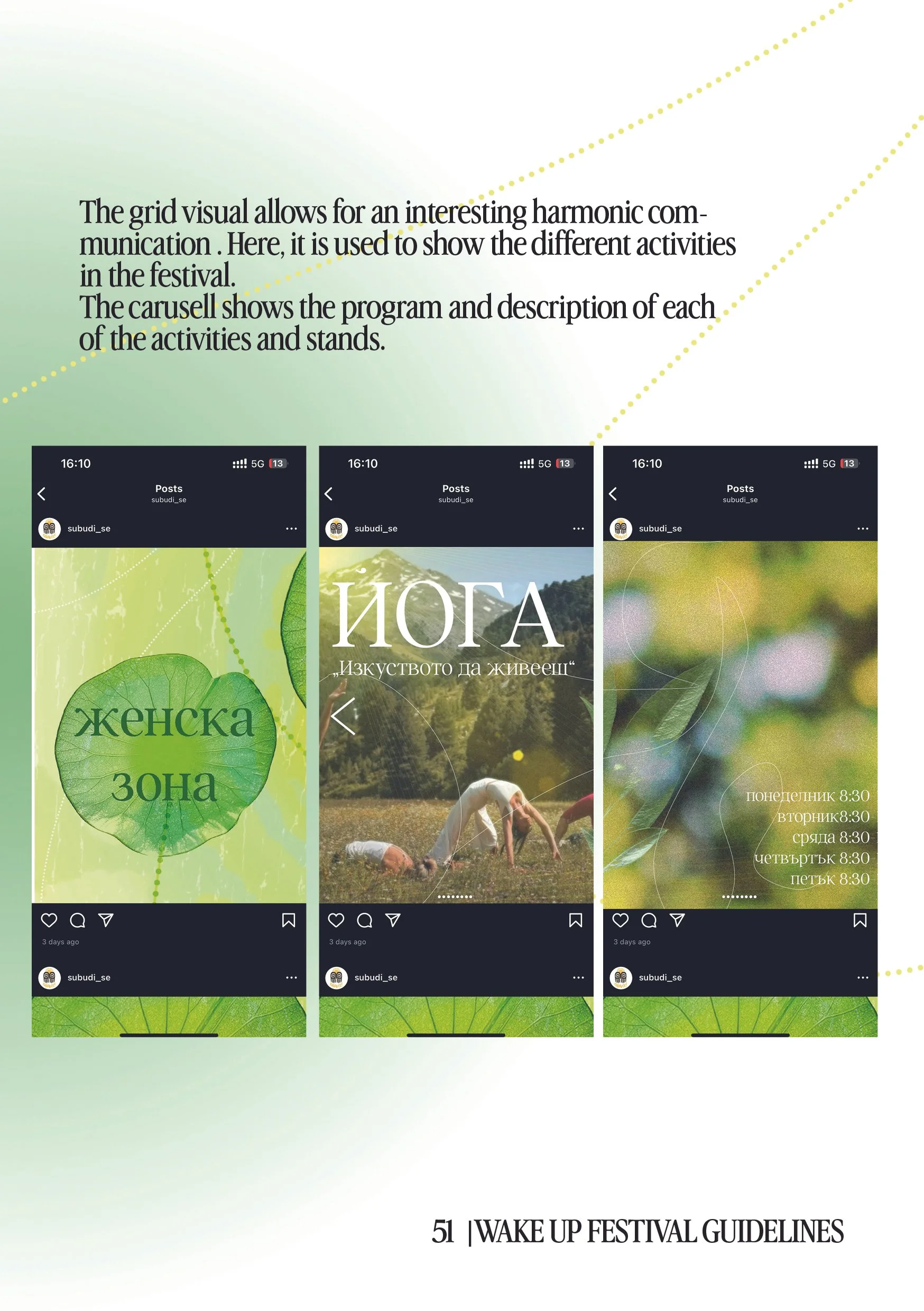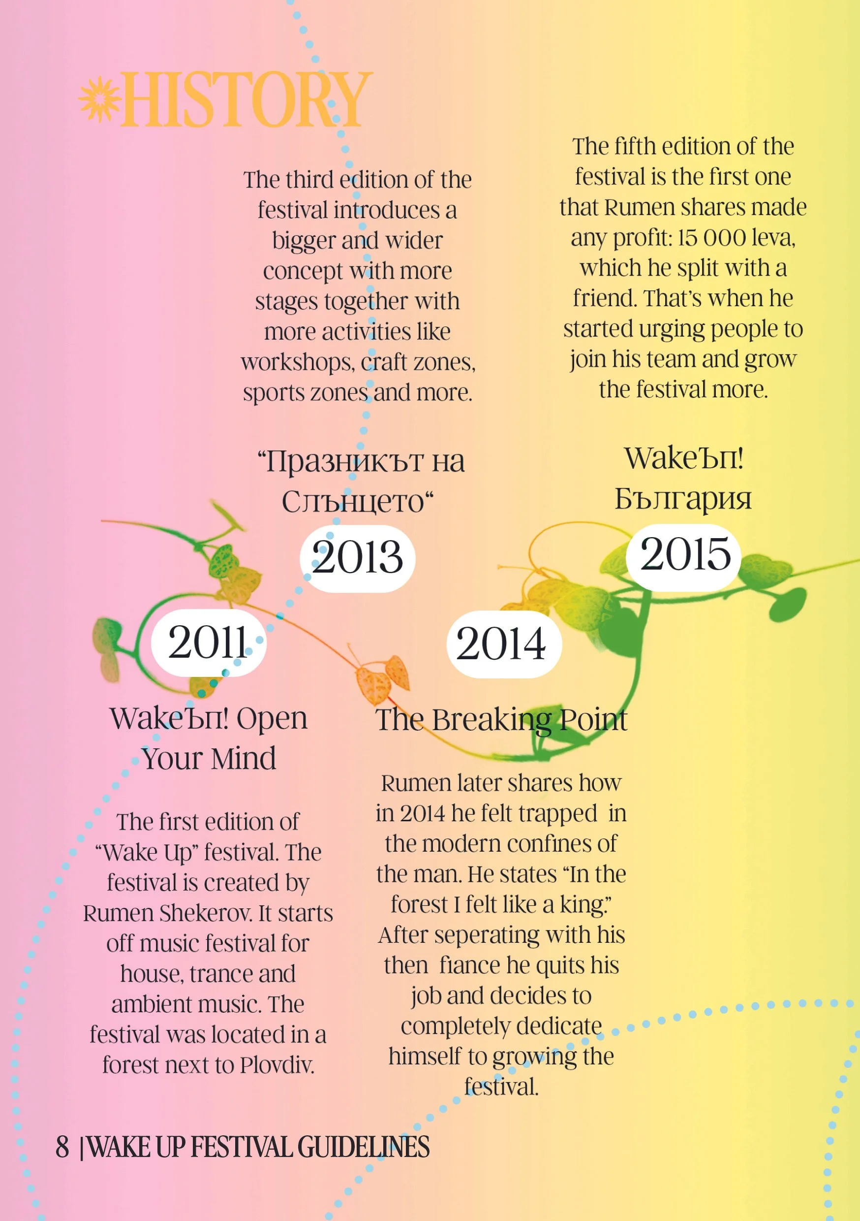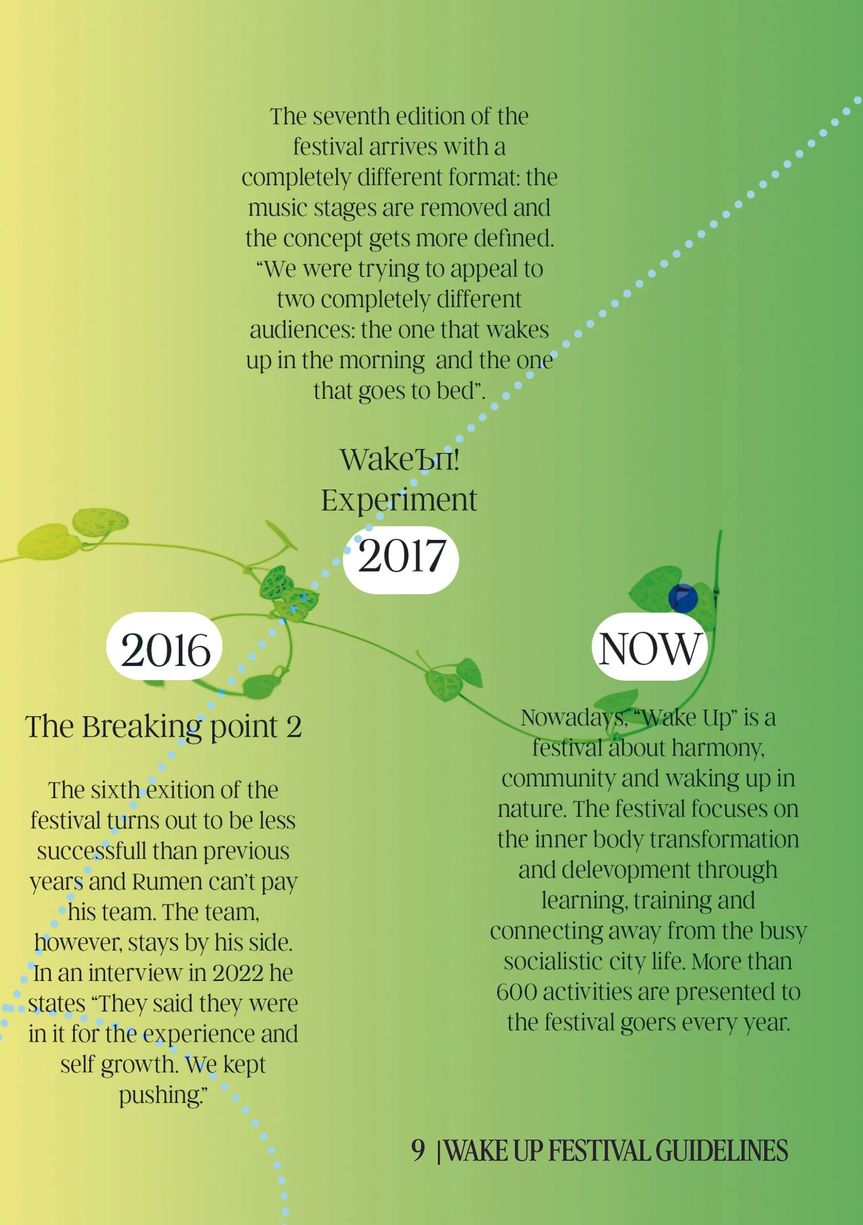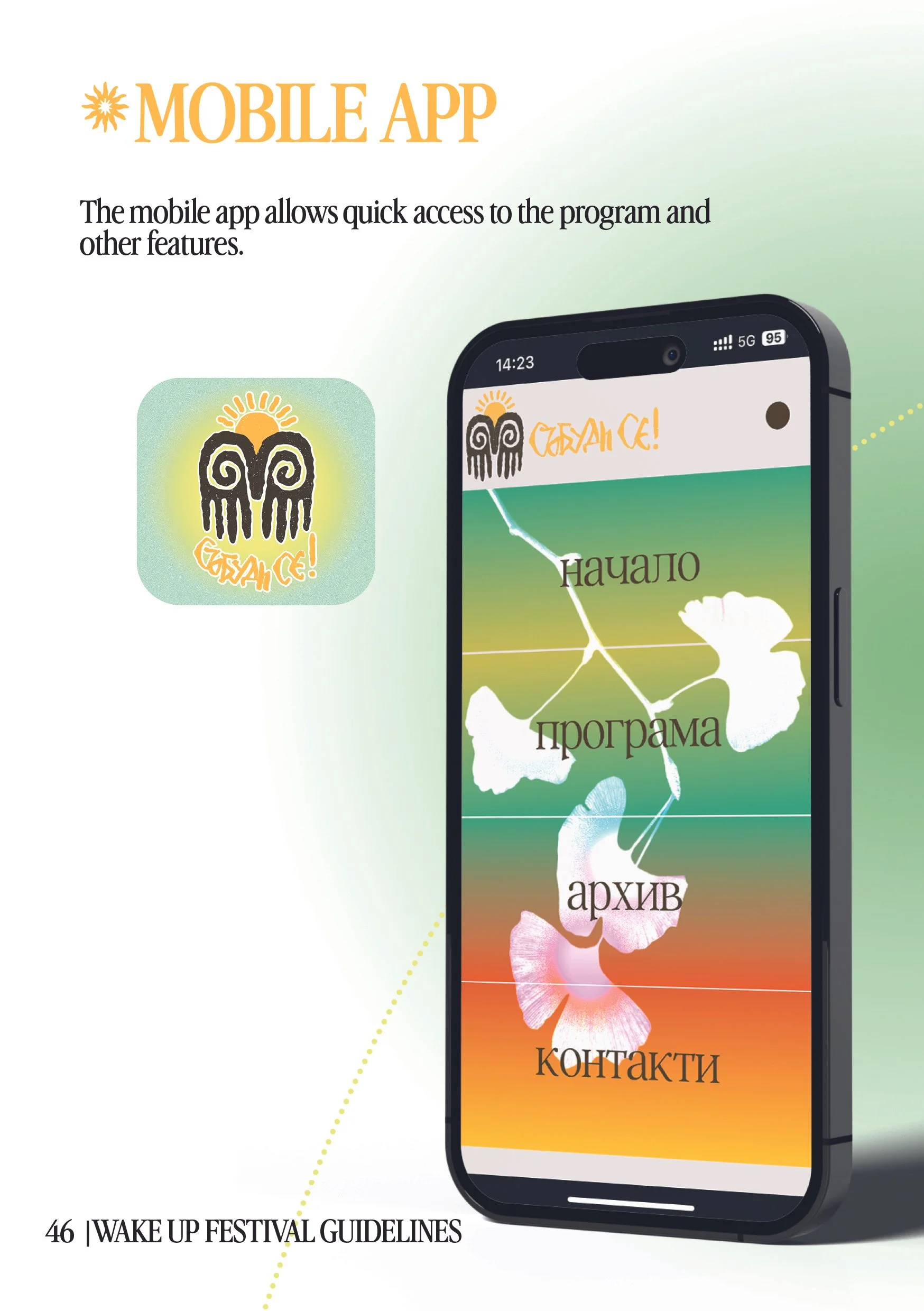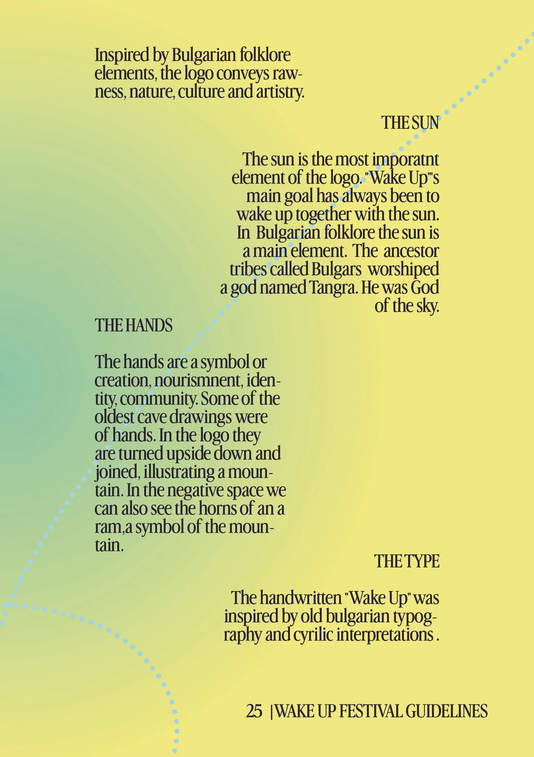 A complete brand manual for the Bulgarian nature festival “Wake Up” (“Събуди се”). The manual includes research, the history of the brand, the target audience, competitors, and a new brand identity. This is a mock-up project and has not been realised.